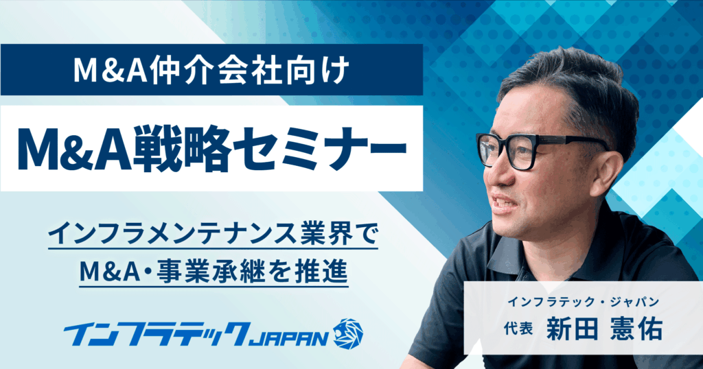 インフラテック・ジャパンでは、M&A仲介会社向け「インフラテック・ジャパン M&A戦略セミナー」(WEBセミナー・個別面談)を随時実施しています。
