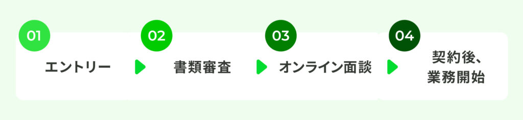 まずは、エントリーをお願いします。その後、書類審査を通過された方と、オンライン面談をさせて頂きます。全ての選考を通過された方は、契約締結後、業務を開始していただきます。