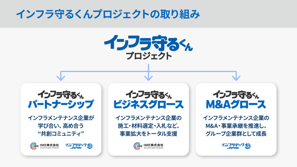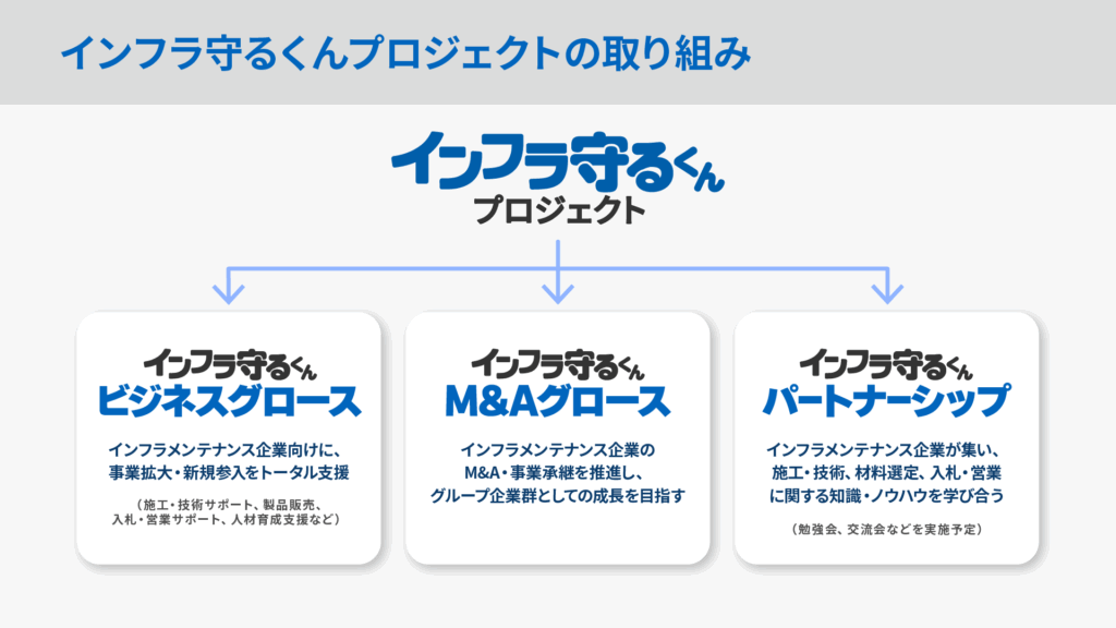 本プロジェクトは、「インフラ守るくんビジネスグロース」、「インフラ守るくんM&Aグロース」、「インフラ守るくんパートナーシップ」という、主に3つの取り組みを行っていきます。詳しくは、各ページをご参考ください。