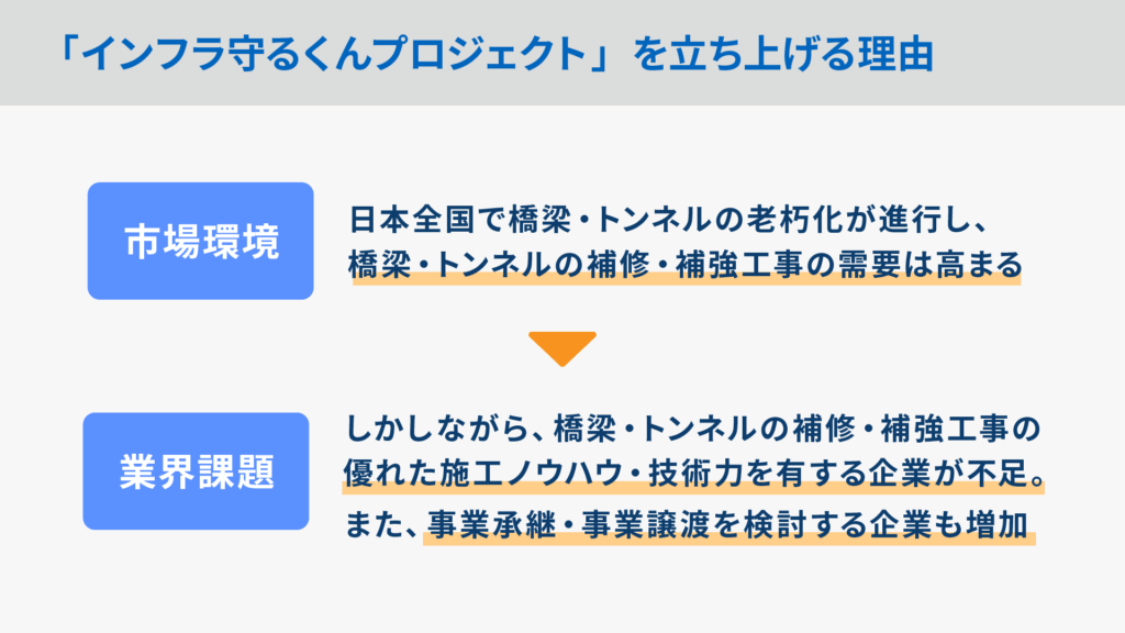 私たちが、本プロジェクトを立ち上げる背景には、インフラの老朽化により、インフラメンテナンスの需要は高まるが、その反面、「優れた施工ノウハウ・技術力を有するインフラメンテナンス企業が少ない」、「事業承継・事業譲渡を検討する企業も増加している」などの業界課題があります。