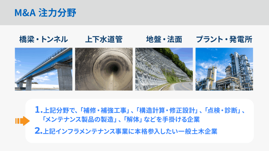 インフラテック・ジャパンでは、橋梁・トンネル・道路、上下水道管、地盤・法面、プラント・発電所などの社会インフラ・産業インフラ分野において、点検・診断、補修・補強、解体を行う「インフラメンテナンス企業」をM&A対象としています。また、これらの分野に新規参入を検討している一般土木企業のM&Aを検討することも可能です。