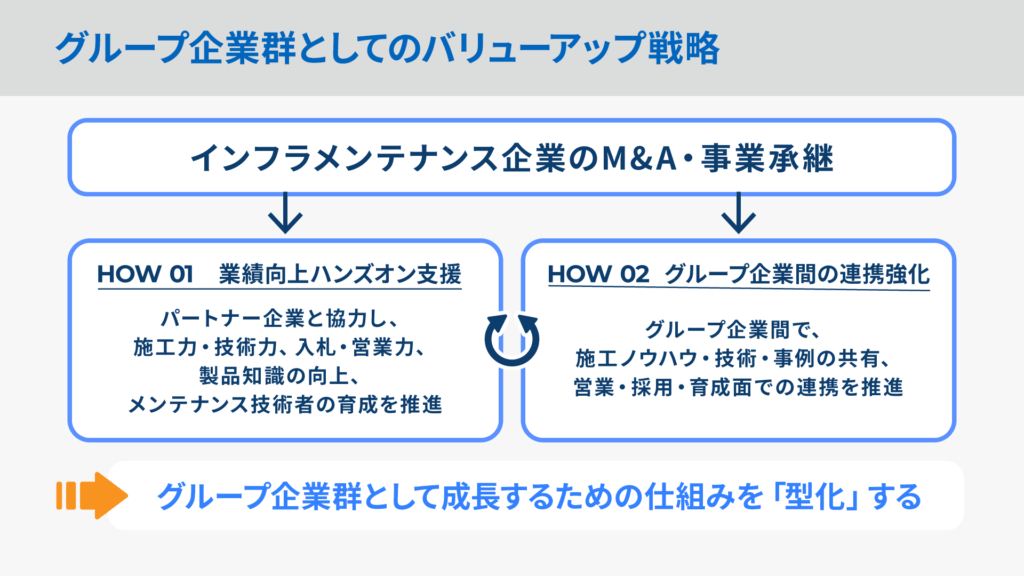 当社は、「業績向上ハンズオン支援」、「グループ企業間の連携強化」の”仕組み化・型化”によるバリューアップ戦略を推進し、グループ企業群としての成長を目指して参ります。