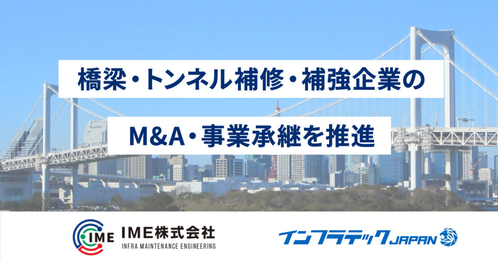 2025.10.21 ニュースリリース IMEとの協業によるM&A戦略(橋梁・トンネル補修・補強企業のM&A・事業承継)のページを公開 IMEとの協業によるM&A戦略(橋梁・トンネル補修・補強企業のM&A・事業承継)のページを公開しました。 IMEとの協業によるM&A戦略