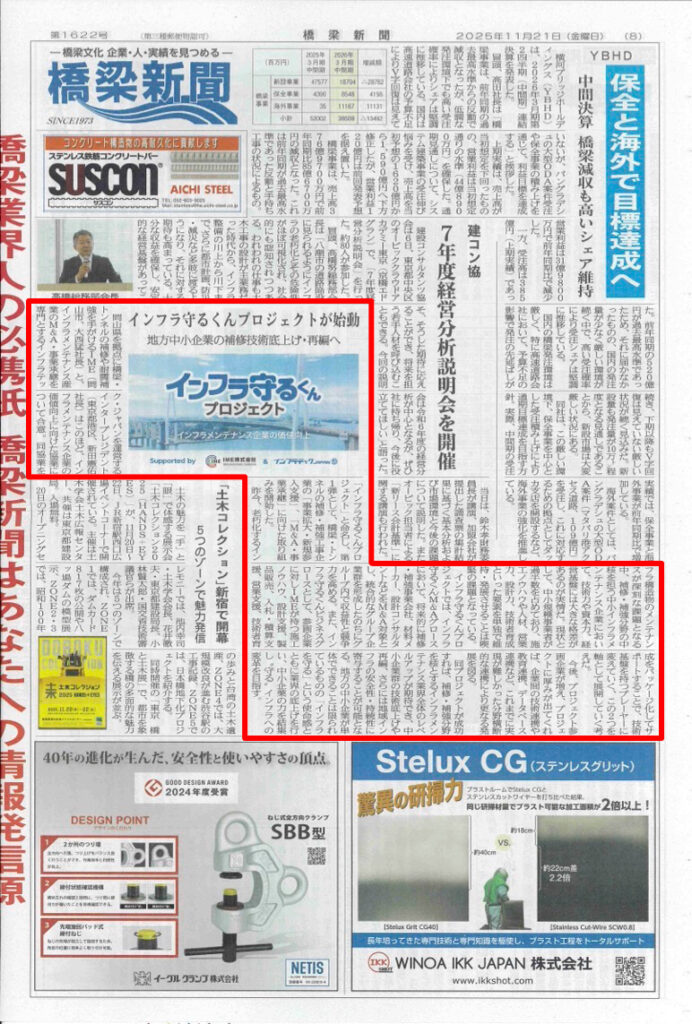 橋梁業界紙「橋梁新聞」(2025年11月21日号)に、「IMEとの協業」および「インフラ守るくんプロジェクト」について、掲載いただきました。橋梁新聞の皆様、ありがとうございました。