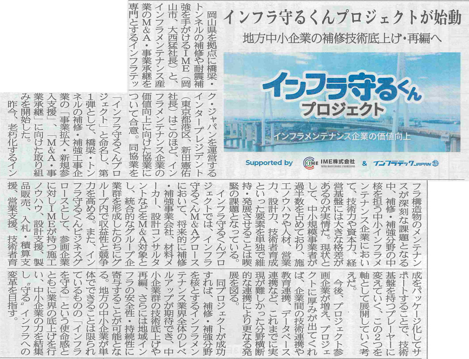 橋の専門新聞「橋梁新聞」に、「IMEとの協業」および「インフラ守るくんプロジェクト」が掲載されました