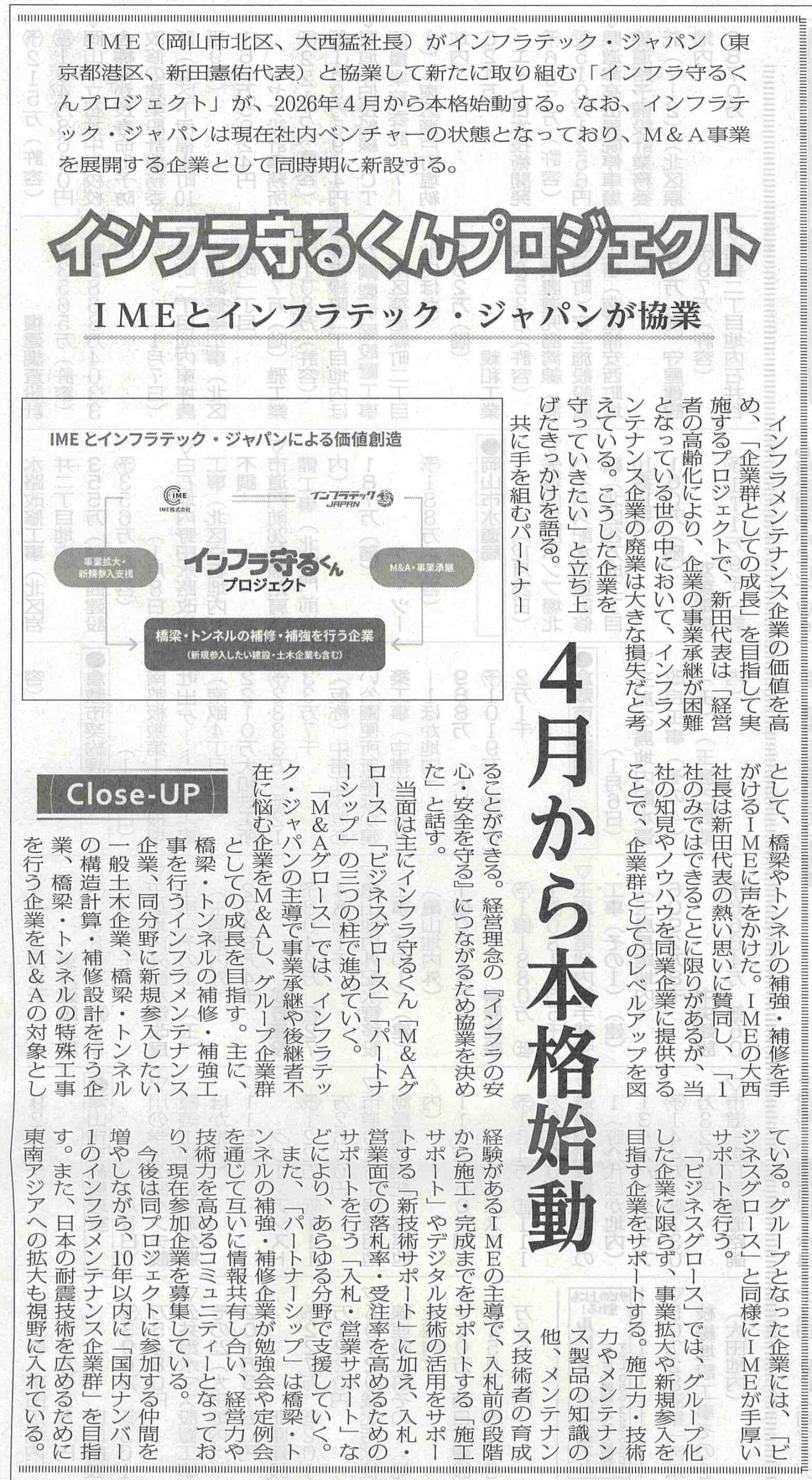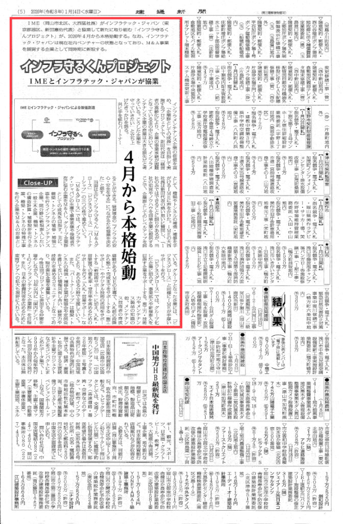 建設業界の専門紙「建通新聞」(2026年1月14日)に、IMEとの協業による「インフラ守るくんプロジェクト」について、掲載いただきました。大変丁寧に取材いただき、誠にありがとうございました。