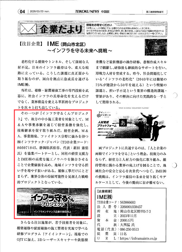 帝国データバンクが発行する「週刊帝国ニュース」に、IMEおよび「インフラ守るくんプロジェクト」が取り上げられました。掲載いただき、ありがとうございました。